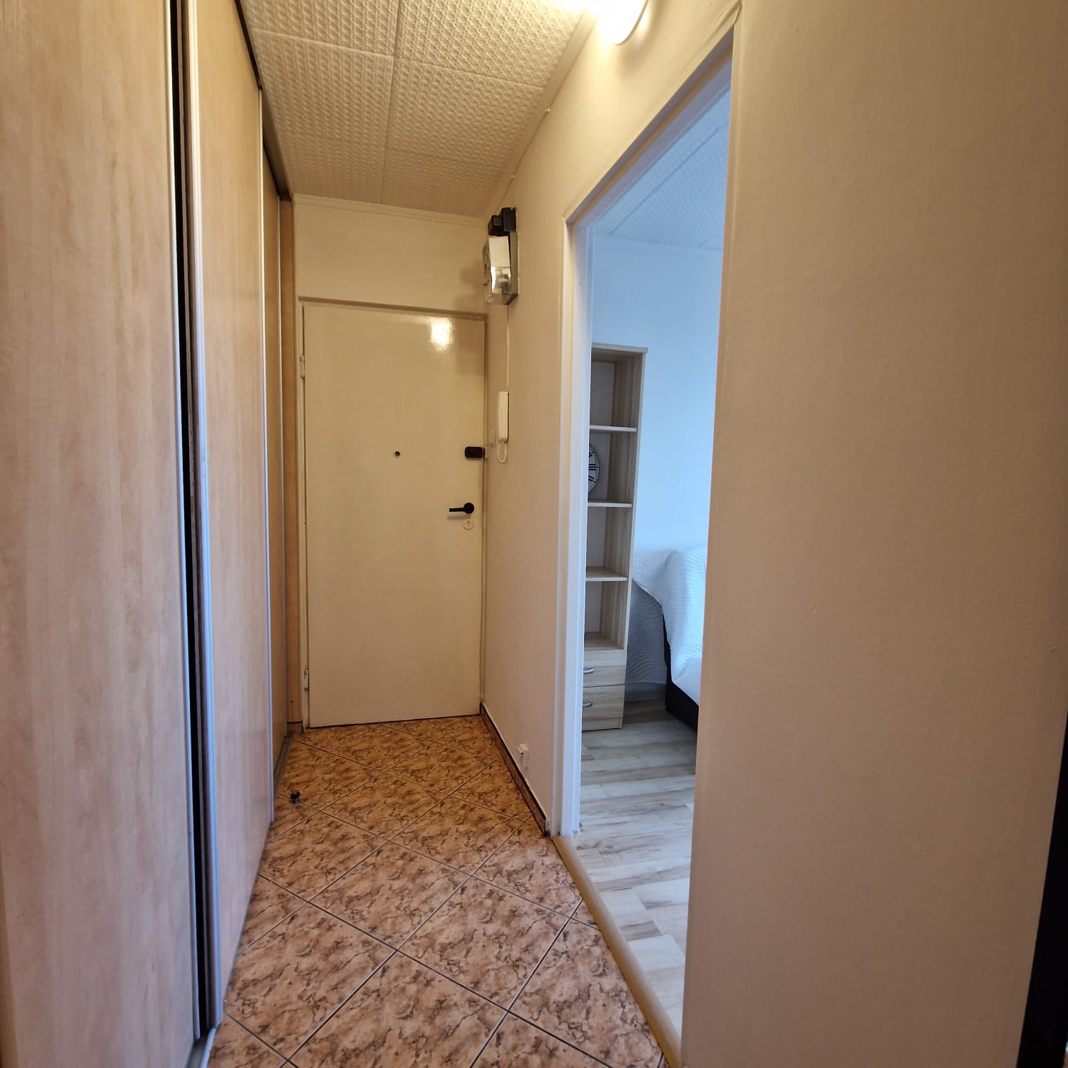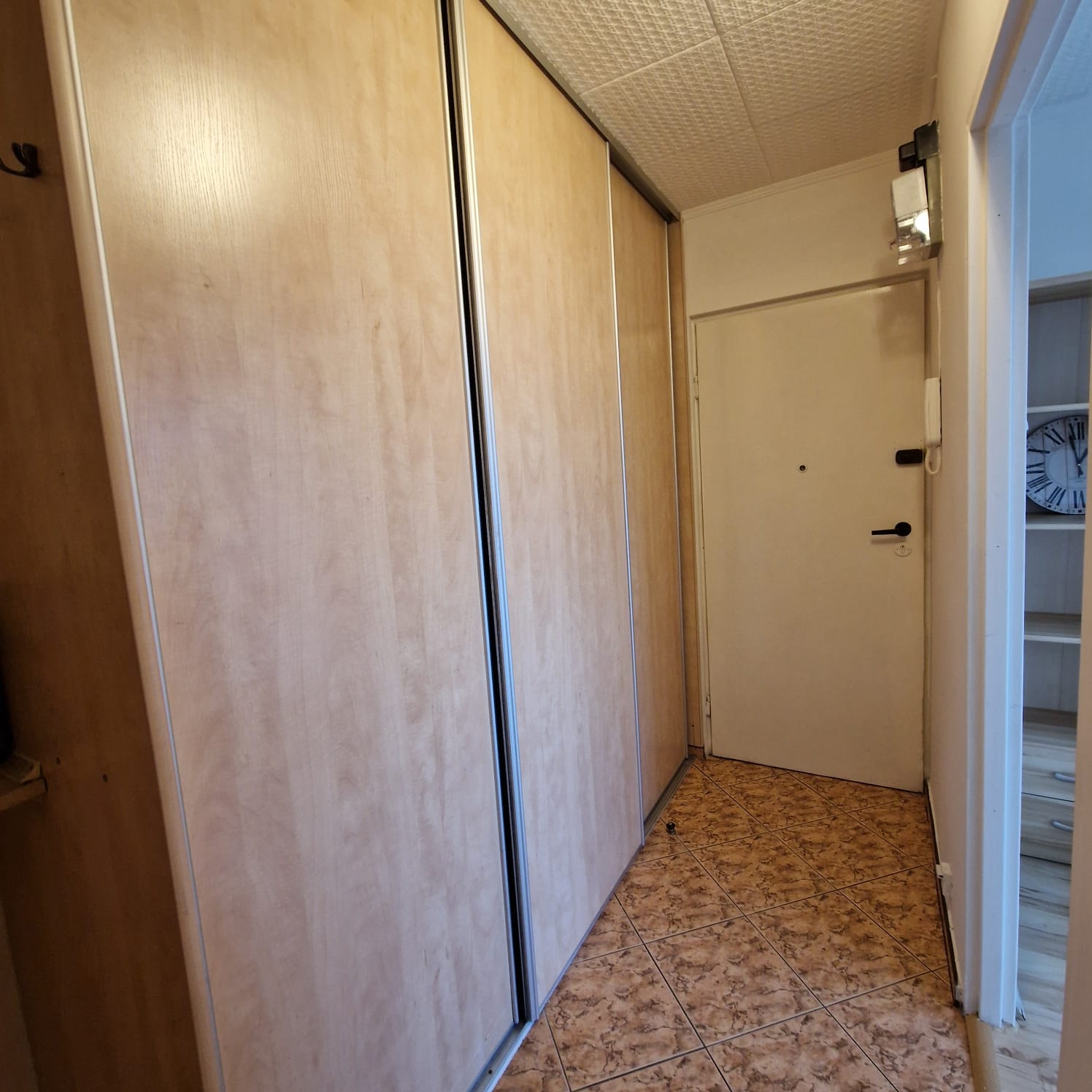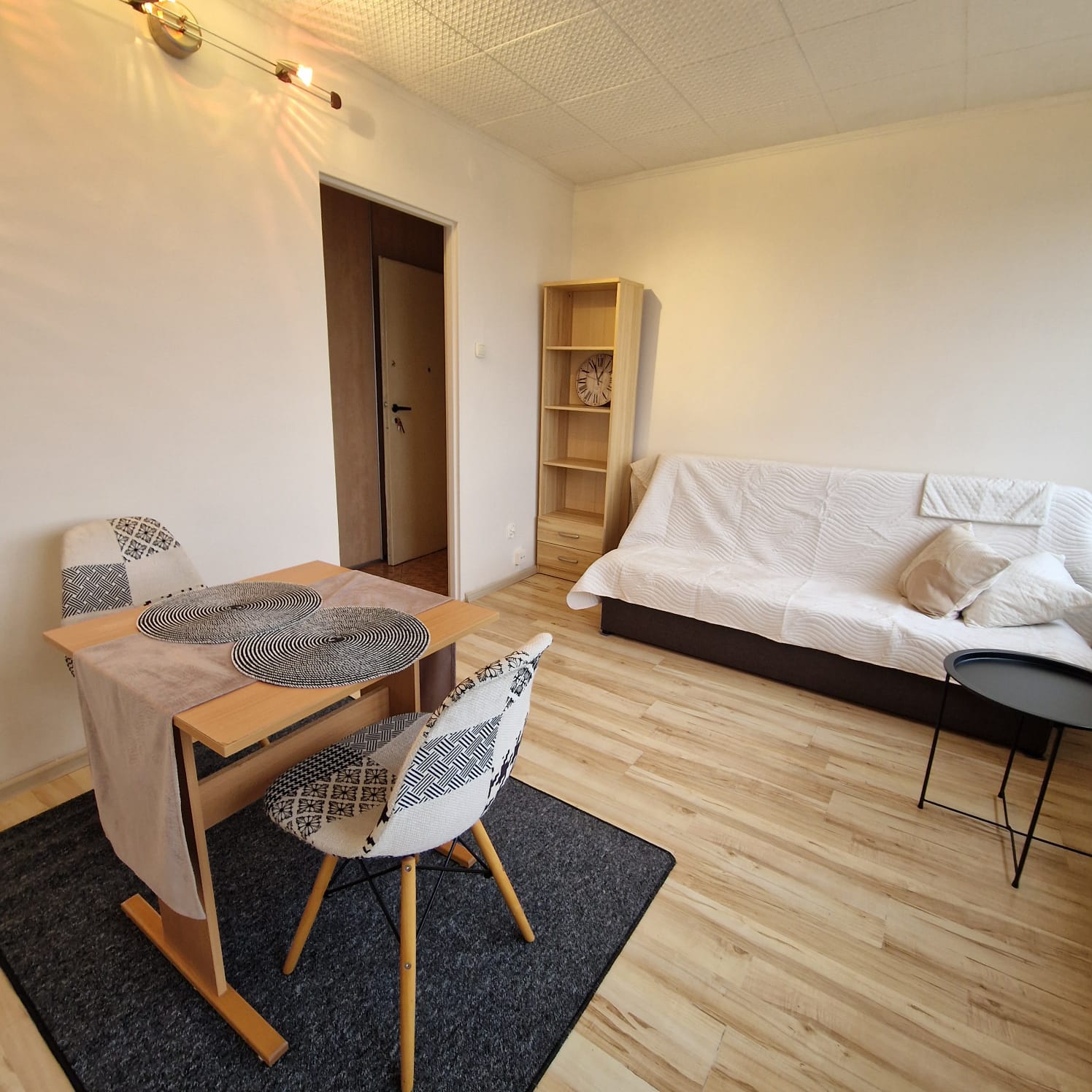 Mieszkanie jednopokojowe, otwarta kuchnia, łazienka z wanną, przedpokój, w którym znajduje się duża szafa w zabudowie.