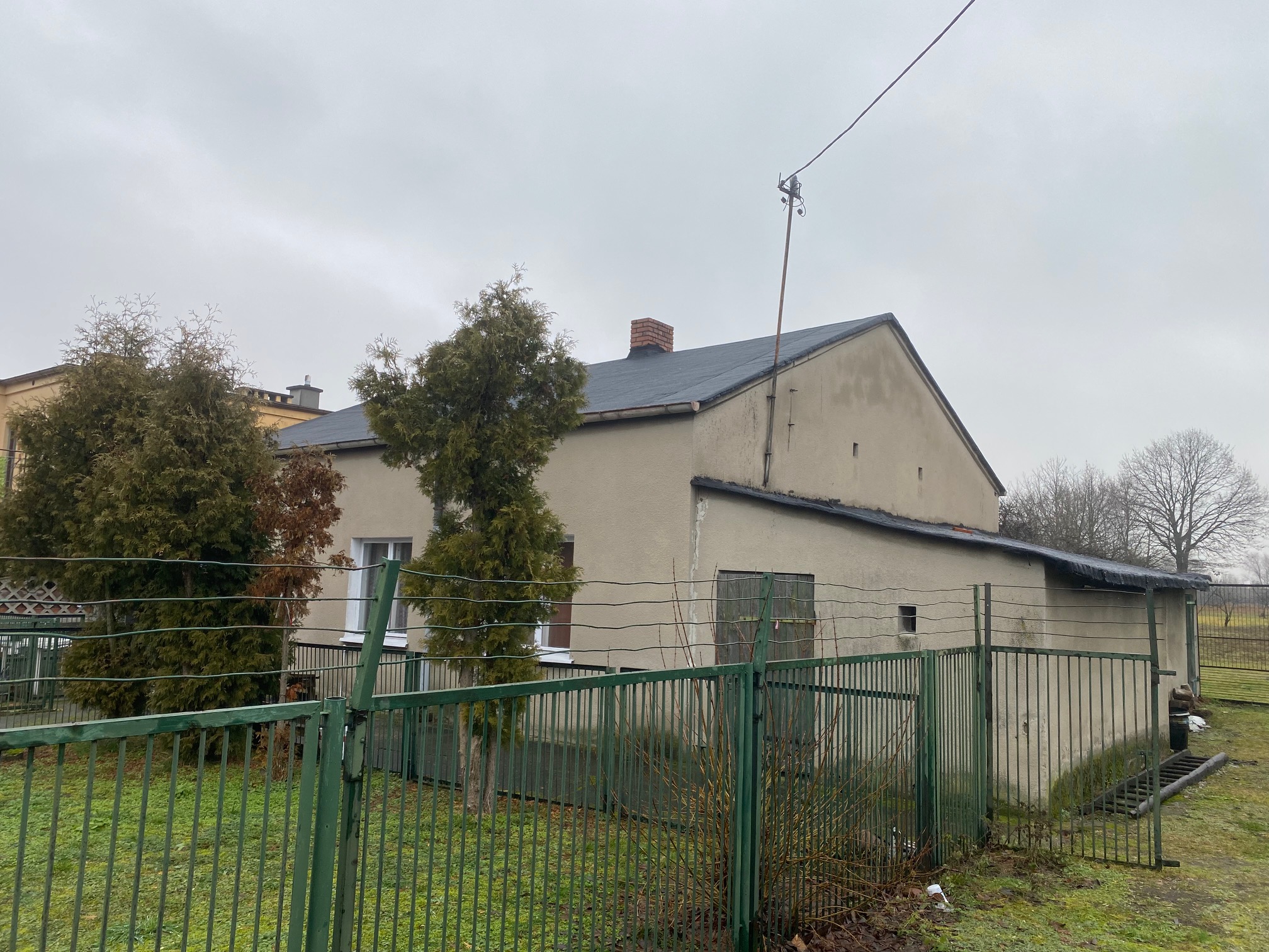 Budynek do remontu, wybudowany z cegły z dachem dwuspadowy pokrytym papą. Okna drewniane skrzynkowe. Ogrzewanie węglowe, ciepła woda z bojlera elektrycznego. Budynek z poddaszem do zagospodarowania.