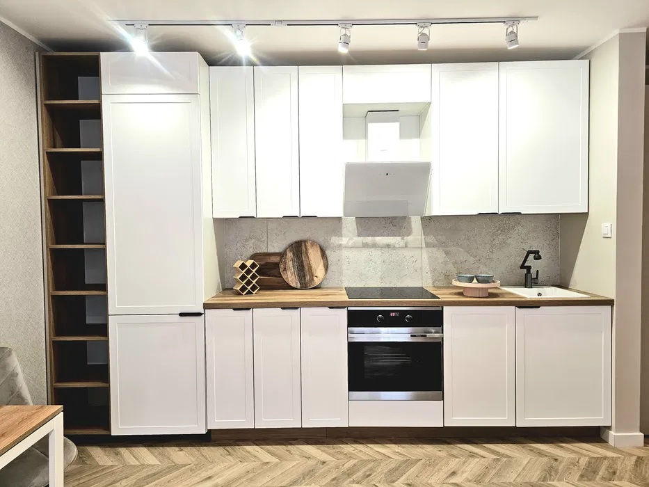 Kuchnia wyposażona w meble kuchenne oraz nowy sprzęt AGD (elektryczny piekarnik, pochłaniacz/okap, płyta indukcyjna), przygotowano miejsce na zmywarkę oraz lodówko-zamrażarkę w zabudowie. W łazience zainstalowano kabinę prysznicową i przygotowano miejsce na pralkę. W przedpokoju oraz w sypialni szafy.
